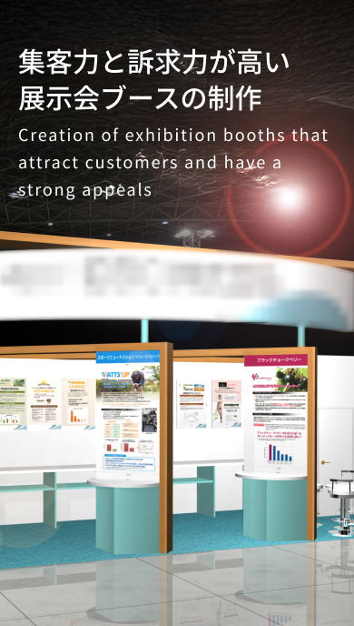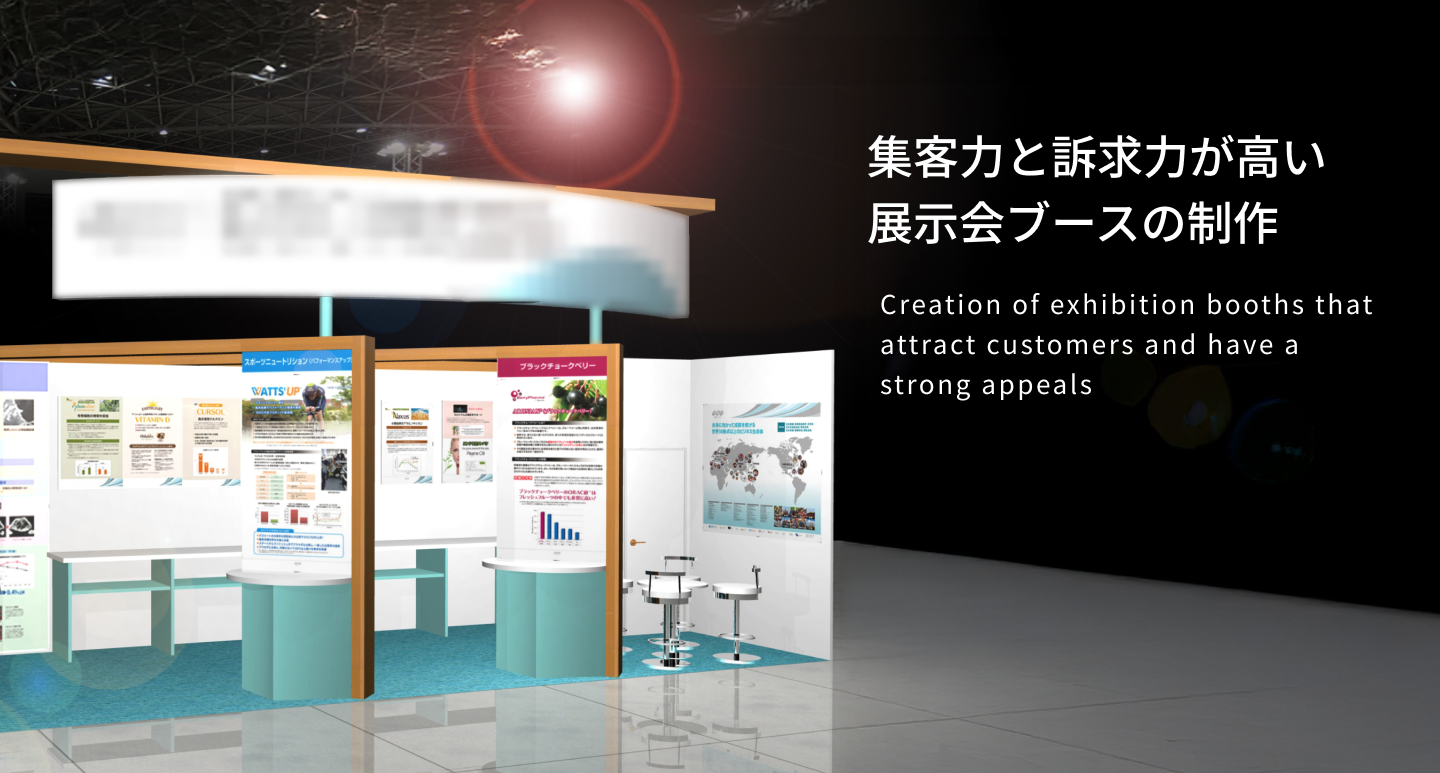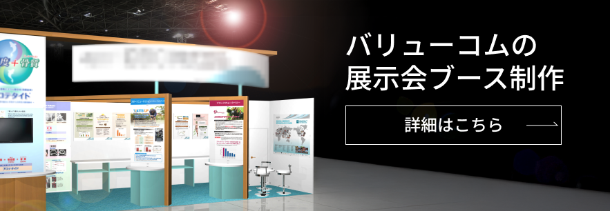 私たちバリューコムは、様々な業種の企業様の展示会ブースのデザイン・設計・施工・設営やイベント会場の装飾デザイン・施工、そして、付随するパネル、動画、パンフレット・フライヤー、ノベルティ等の各種制作業務で数多くの実績を有しています。